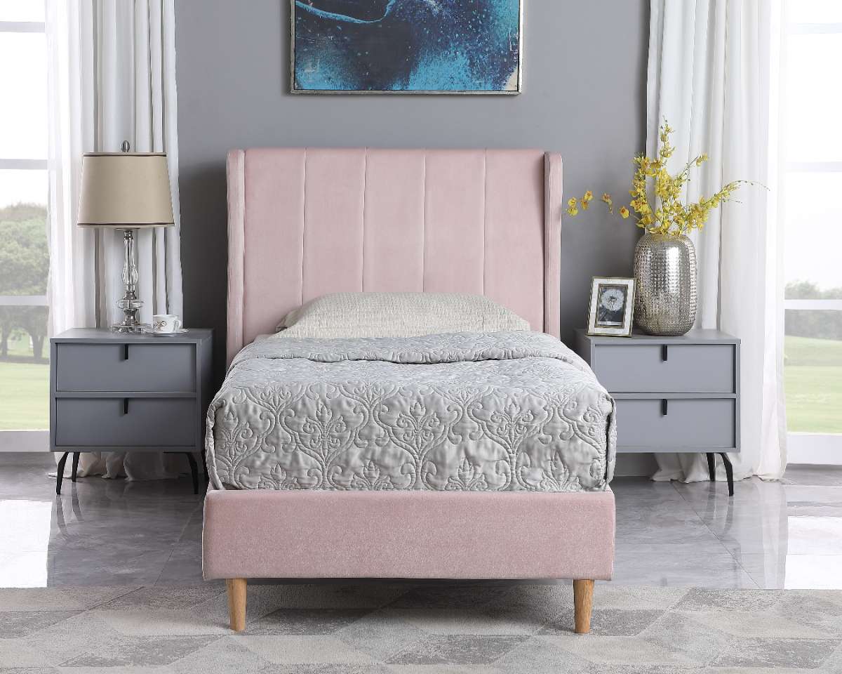 Transform your bedroom into a cozy haven with the stunning Amelia 3' Bed, beautifully upholstered in soft pink velvet fabric. This bed combines style and comfort, making it the perfect centerpiece for any room.