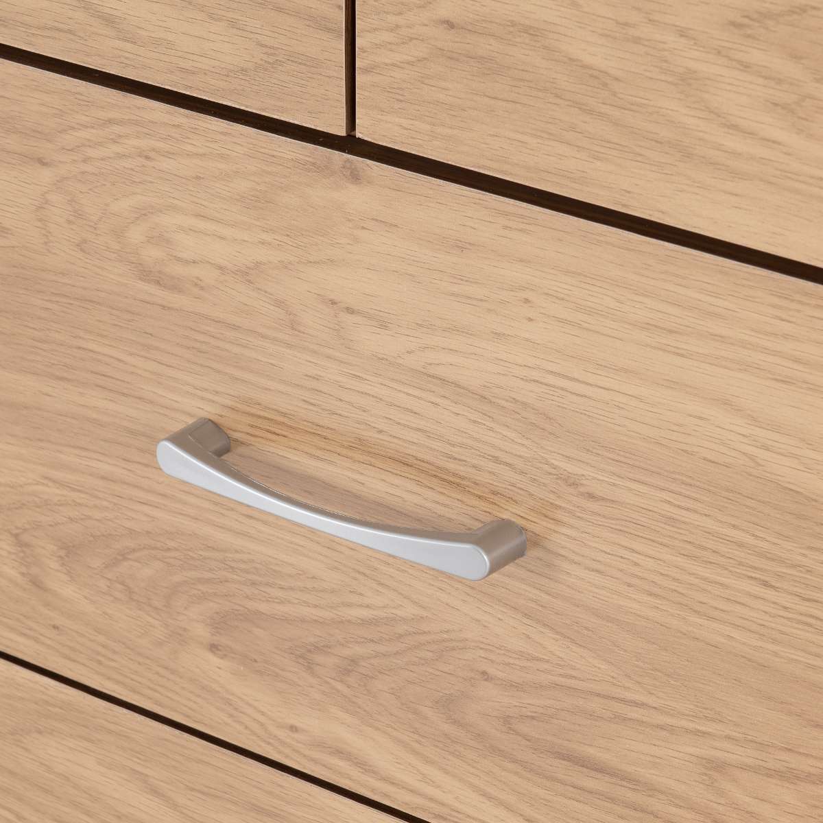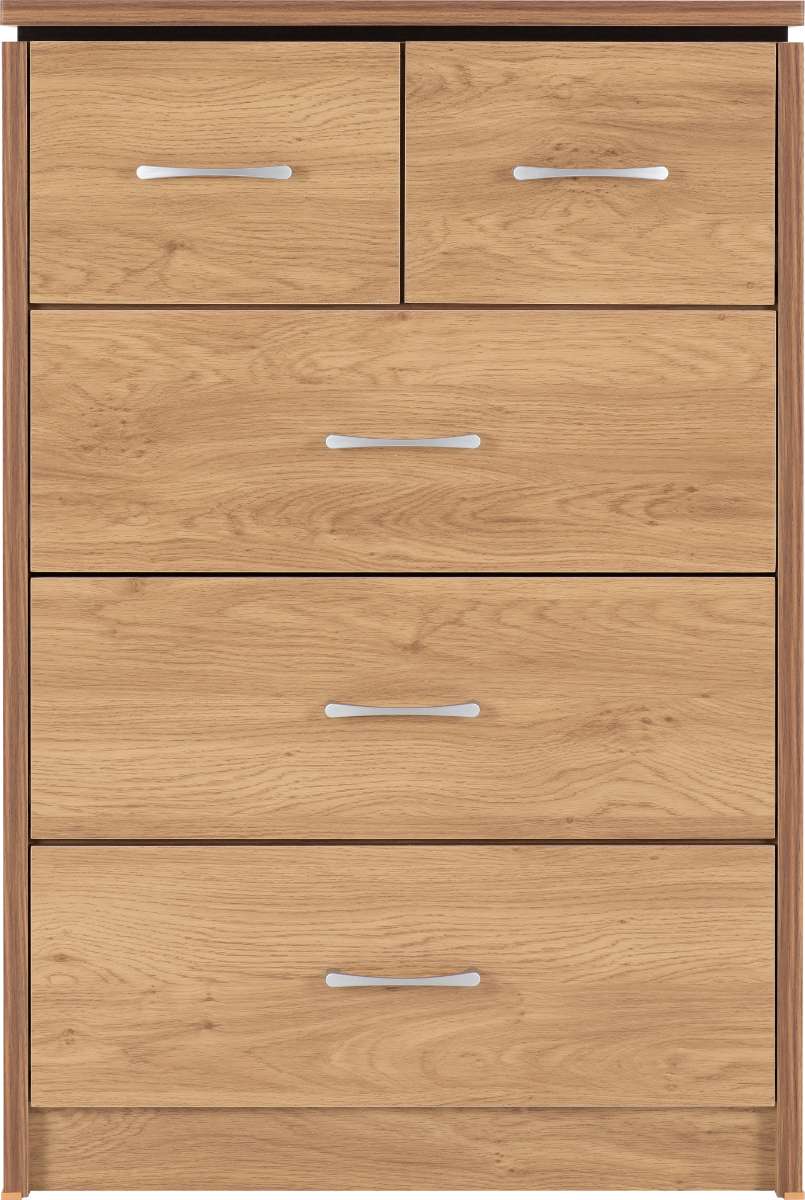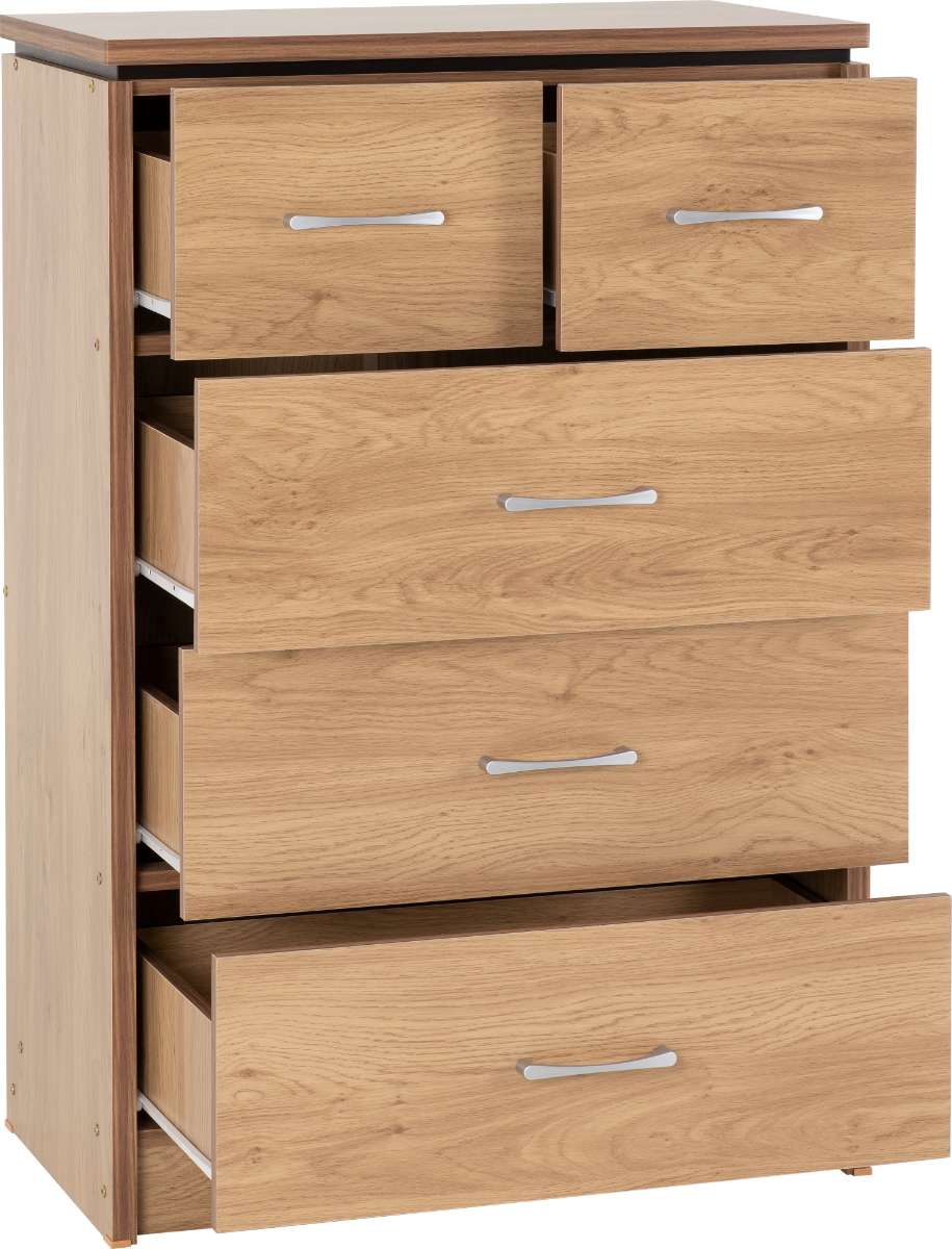 Introducing the Charles 3+2 Drawer Chest, a stylish and functional addition to your bedroom or living space. Crafted with a stunning oak effect veneer and accented with rich walnut trim, this chest not only provides ample storage but also adds a touch of elegance to your decor.