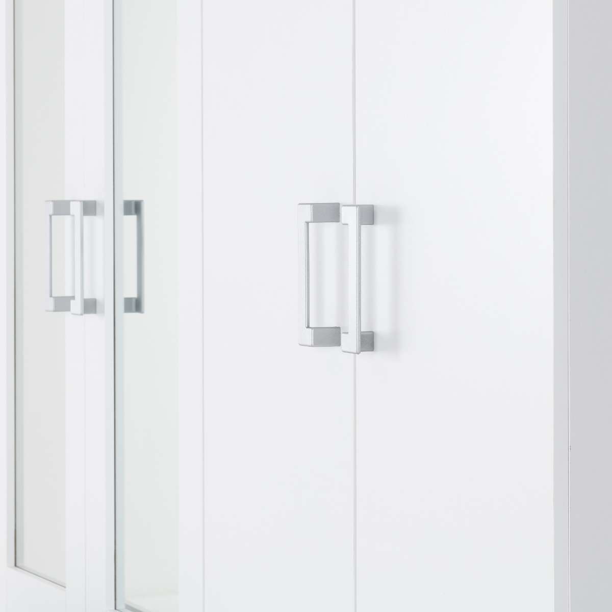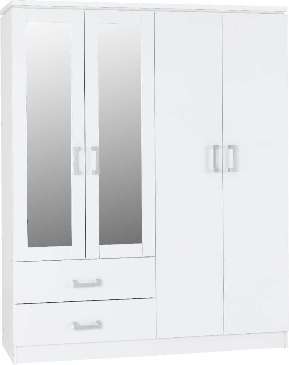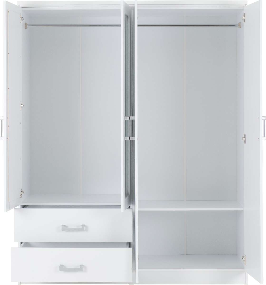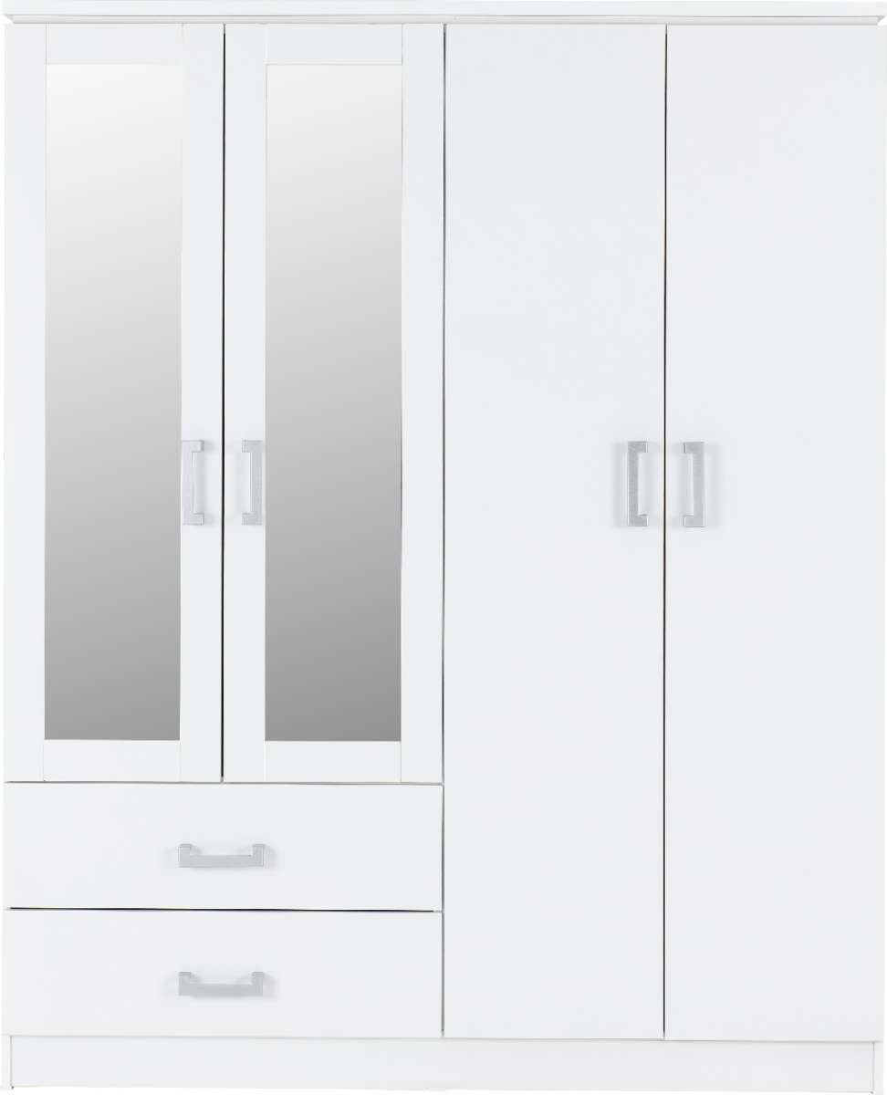 Introducing the Charles 4 Door 2 Drawer Mirrored Wardrobe in a sleek white finish! This stylish wardrobe is designed to not only enhance your bedroom decor but also provide ample storage for all your clothing and accessories.