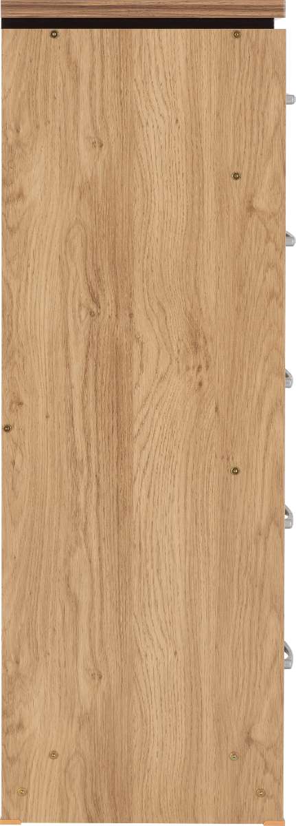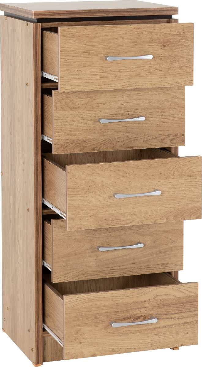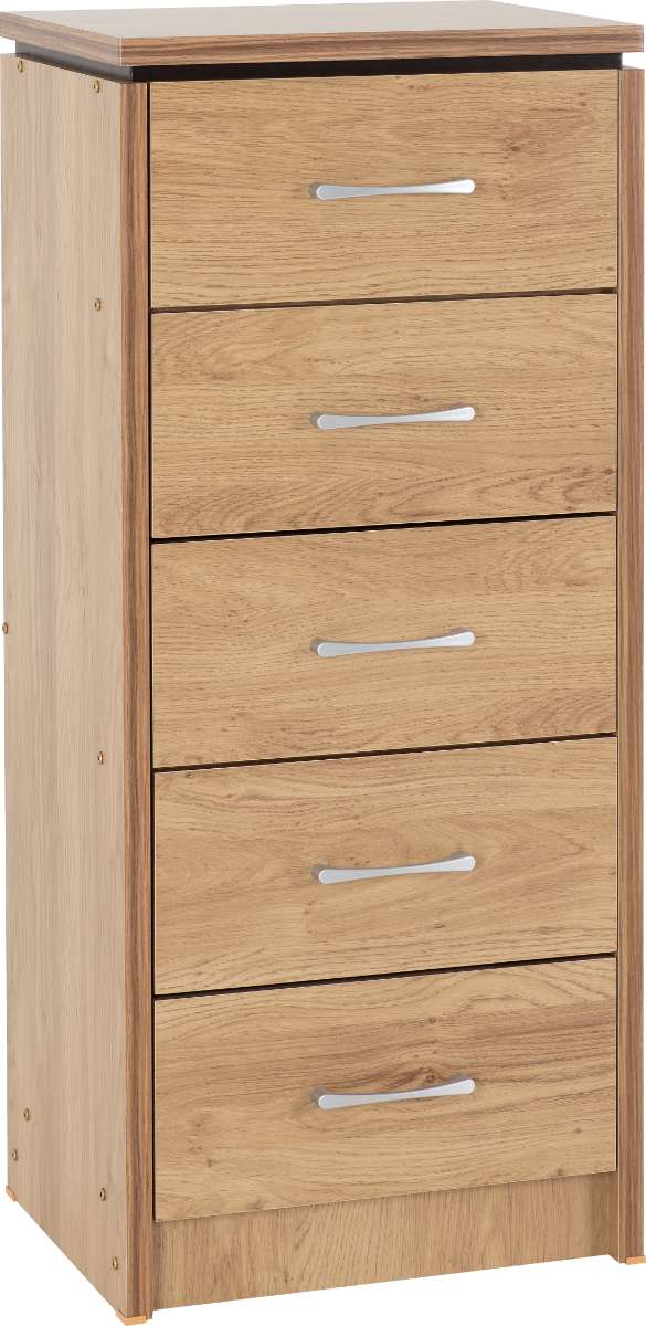 Meet the Charles 5 Drawer Narrow Chest, a stylish and practical addition to your home. With its beautiful oak effect veneer and elegant walnut trim, this chest combines functionality with a touch of sophistication.