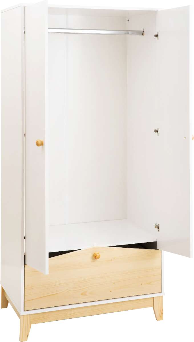 Introducing the Cody 2 Door 1 Drawer Wardrobe, a perfect blend of style and functionality for your bedroom. This wardrobe features a stunning white finish with a natural pine effect, adding a touch of elegance to any space.