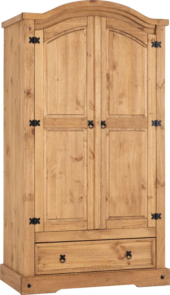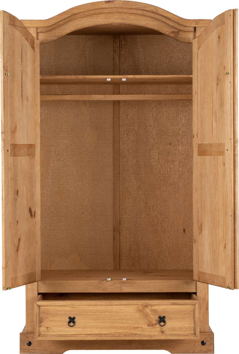 Introducing the Corona 2 Door 1 Drawer Wardrobe, a perfect blend of style and functionality for your bedroom. Crafted from high-quality distressed waxed pine, this wardrobe adds a rustic charm to any space while providing ample storage for your clothes and accessories.