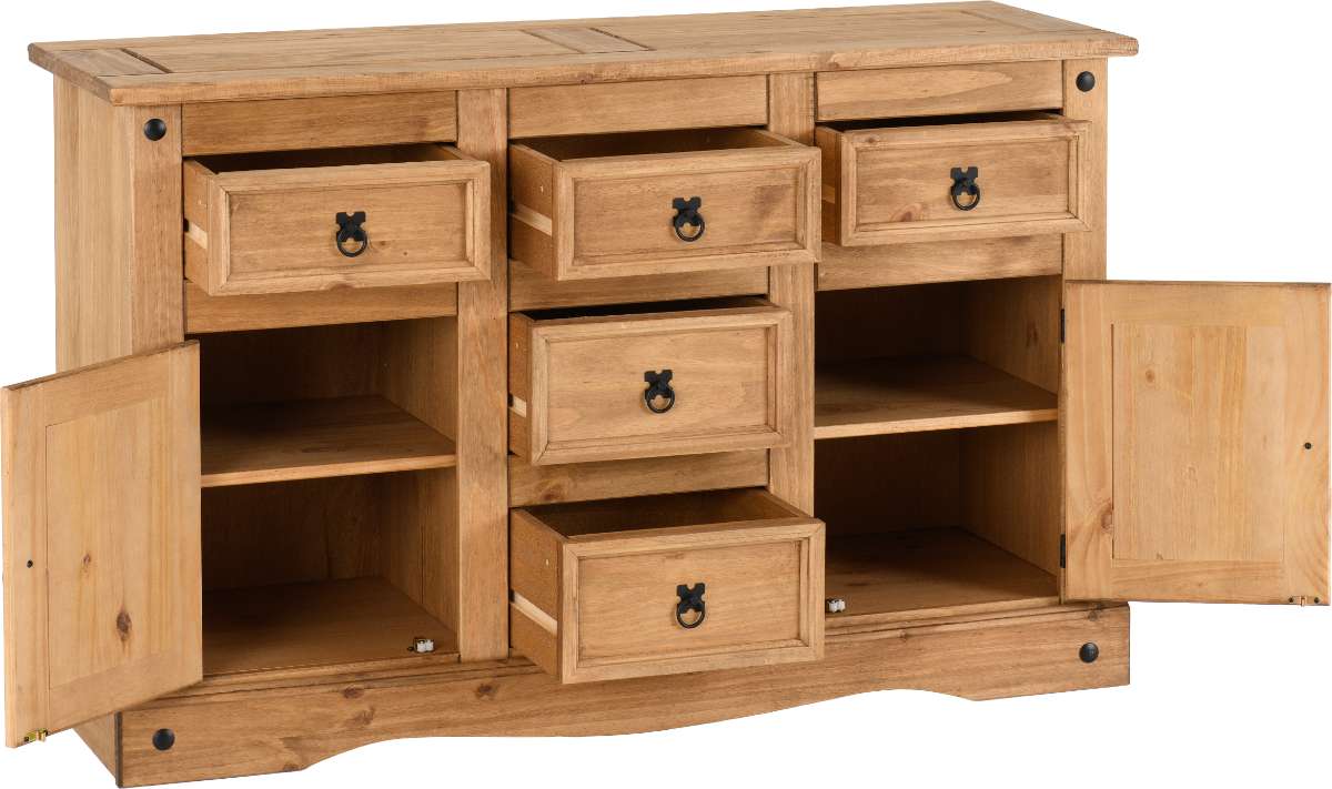 Introducing the stunning Corona 2 Door 5 Drawer Sideboard, crafted from beautiful distressed waxed pine. This stylish piece not only enhances your home decor but also provides ample storage for all your essentials.