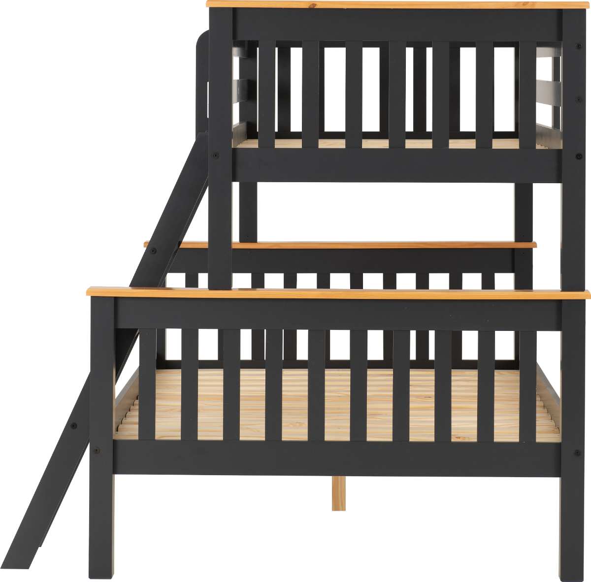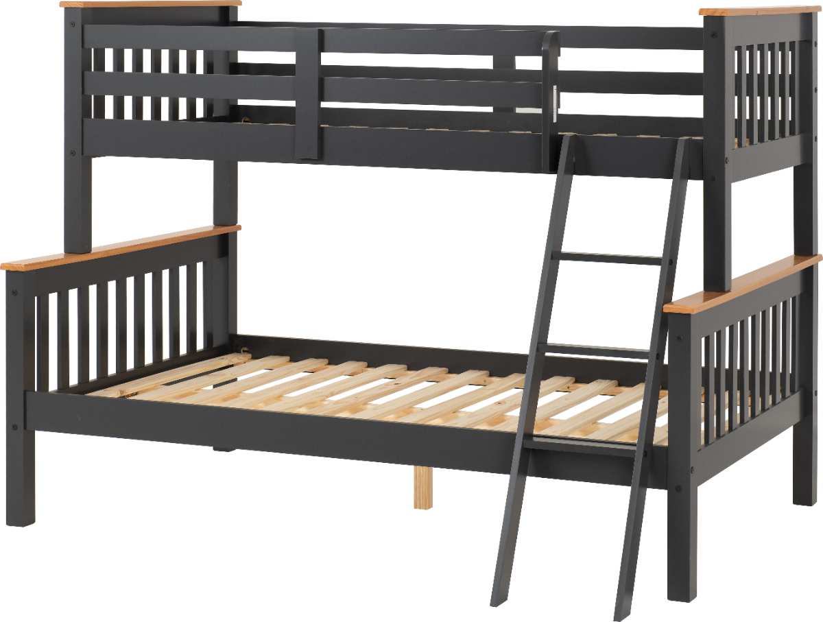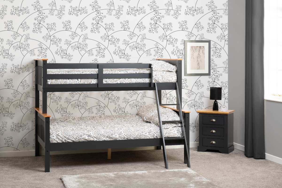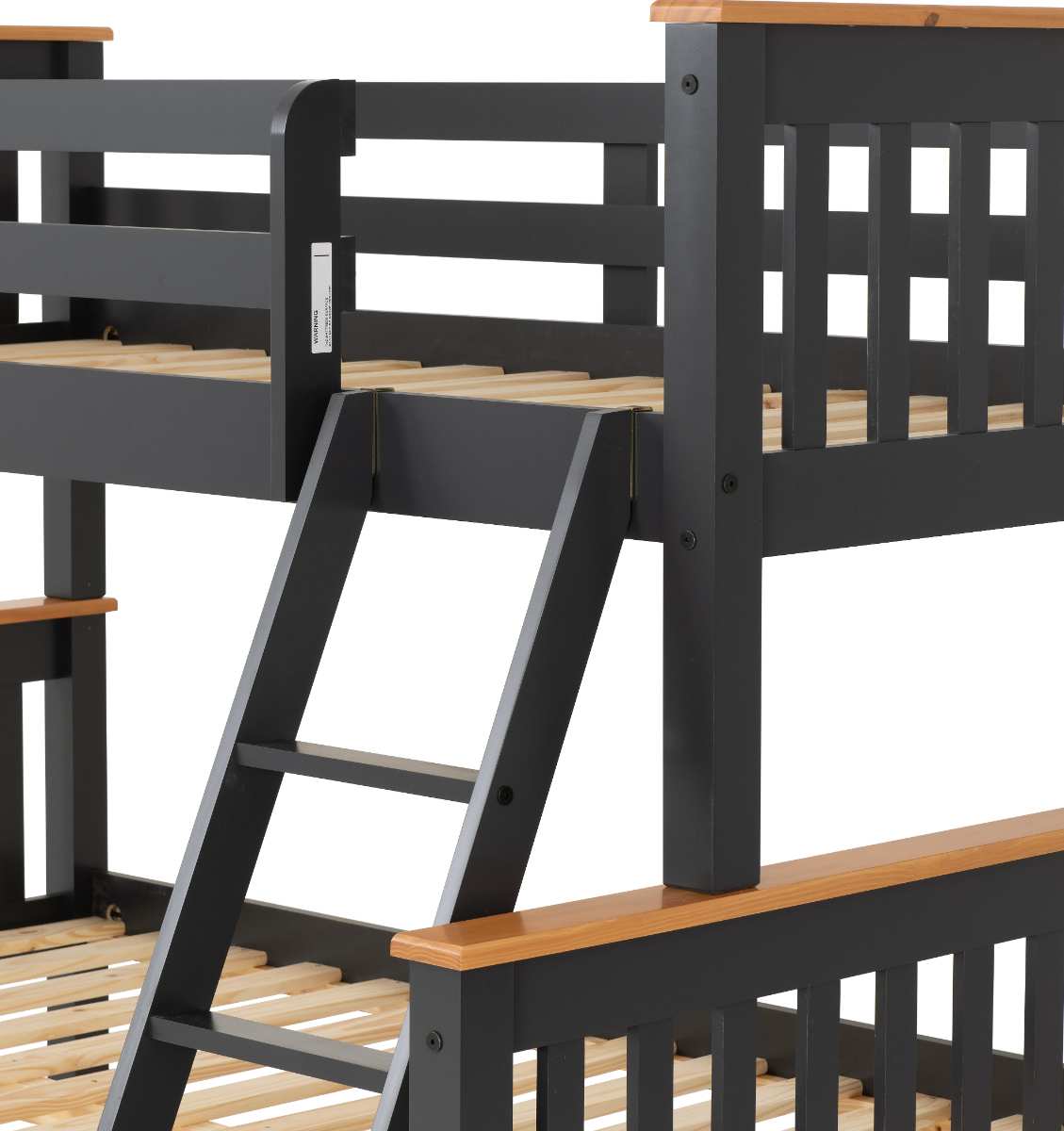 Introducing the Neptune Triple Sleeper Black Wooden Bunk Bed, a stylish and practical solution for maximizing space in your home. This modern bunk bed features a sleek grey and oak finish that effortlessly complements any bedroom decor.